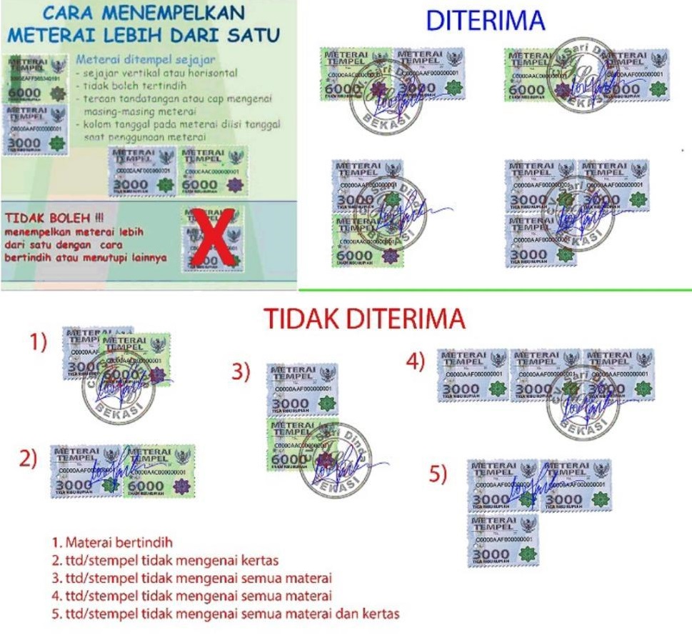 - Menempelkan 3 meterai Rp 3.000 secara berdampingan dalam satu dokumen yang memerlukan meterai.
